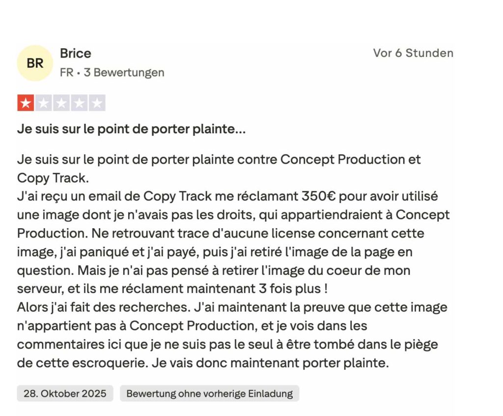Ich erhielt eine E-Mail von Copy Track, in der 350 € für die Nutzung eines Bildes gefordert wurden, für das ich keine Rechte besaß. Angeblich gehörte es Concept Production. Da ich keine Lizenz für dieses Bild finden konnte, geriet ich in Panik, zahlte und entfernte das Bild von der betreffenden Seite. Ich vergaß jedoch, es auch vom Server zu löschen, und nun fordern sie das Dreifache!