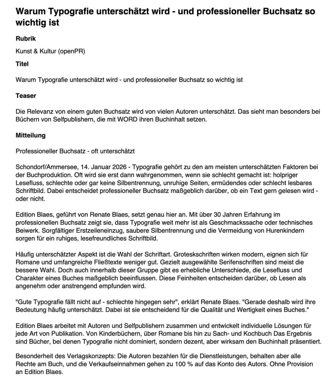 Demzufolge habe ich mich über die Nominierung grundsätzlich und über die obige Formulierung speziell gewundert. Grund: In der Pressemeldung habe ich lediglich darauf hingewiesen, dass Edition Blaes professionellen Buchsatz als Dienstleistung anbietet, und wie wichtig Schriftwahl und manuelle Bearbeitung eines gesetzten Buchinhaltes sind. »Unternehmerische Weitsicht« kann man selbst bei großem Wohlwollen nicht in die Presseinformation hineininterpretieren.