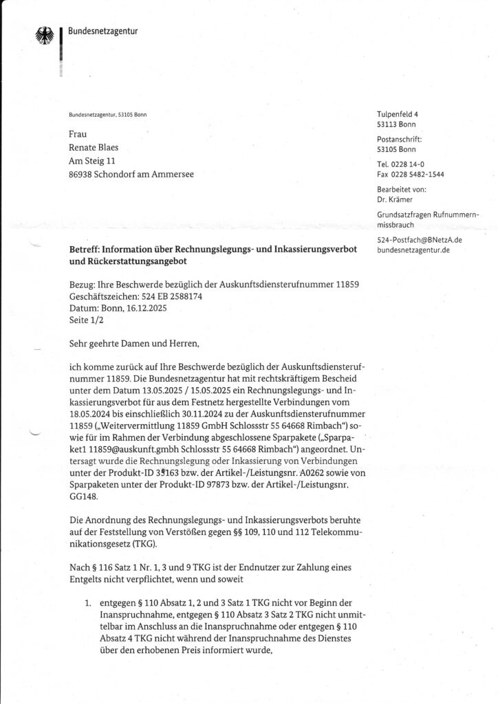 Ich habe weiter recherchiert mit den Begriffen »First Telecom«, »Kundenauskunft« und »11859«. Dabei habe ich erfahren, dass die Bundesnetzagentur die Abschaltung der Telefonnummer 11859 angeordnet hat. Grund: Rufnummernmissbrauch