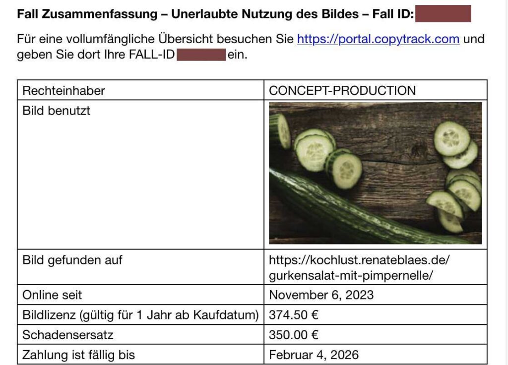 Das Foto habe ich bei meinem Kochlustblog verwendet – und wurde von Copytrack darauf hingewiesen, dass ich es »möglicherweise ohne Erlaubnis« verwende (sh. obigen Screenshot der Mail).