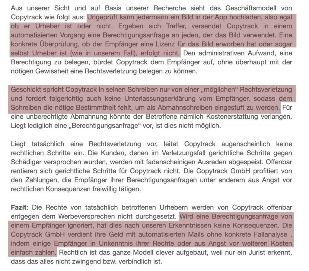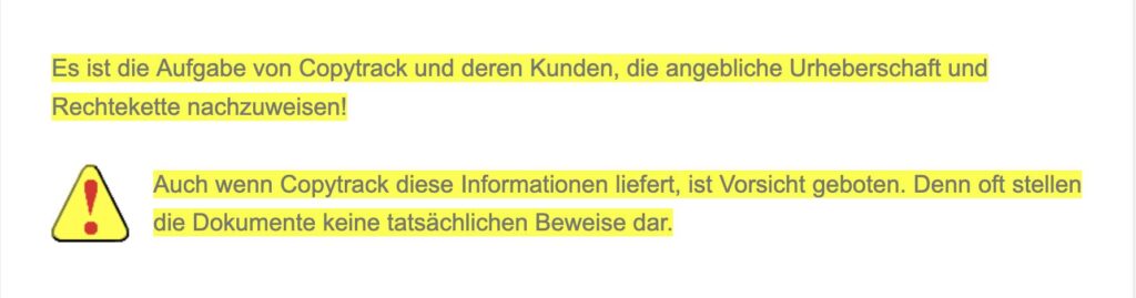 Genau das ist die Masche des als Abmahner kaschierten Unternehmens namens Copytrack. Denn es tut so, als würde es »abmahnen« – das ist aber nicht der Fall. Denn liest man den Text genau, so weist Copytrack lediglich darauf hin, dass möglicherweise eine unberechtigte Verwendung eines Fotos besteht.