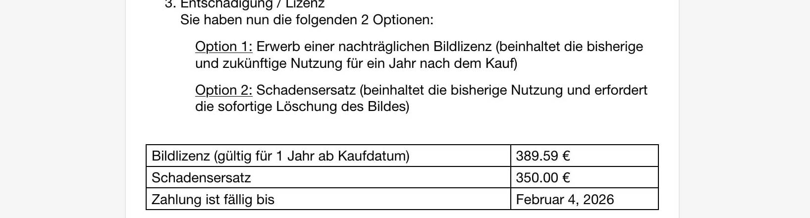 Genau das ist die Masche des als Abmahner kaschierten Unternehmens namens Copytrack. Denn es tut so, als würde es »abmahnen« – das ist aber nicht der Fall. Denn liest man den Text genau, so weist Copytrack lediglich darauf hin, dass möglicherweise eine unberechtigte Verwendung eines Fotos besteht.