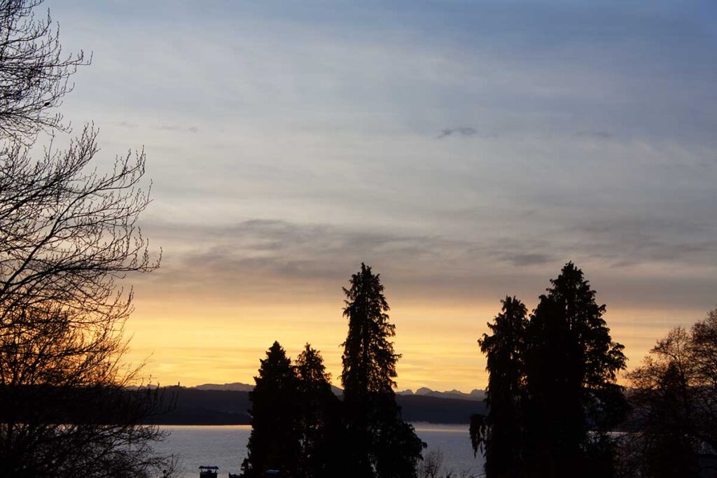 Aufstehen am Ammersee … jeden Morgen bietet sich mir ein anderes Bild. Heute mit zweifarbigem Sonnenaufgang.
