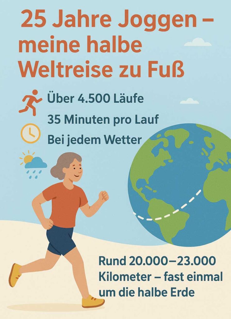 Da ich jeden Tag rund 35 Minuten jogge, bin ich im Laufe der rund 25 Jahre rund 20.000 bis 23.000 Kilometer gelaufen – das entspricht ungefähr einer halben Erdumrundung am Äquator!
